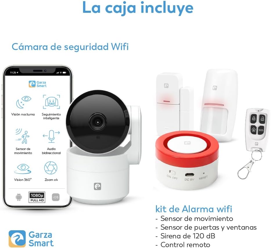 Garza Smart 401280FBM Kit Alarma WiFi 2,4 GHz con Cámara 1080p 360º – Sirena 120 dB + Luz Estroboscópica, Sensor Movimiento y Apertura Puerta/Ventana, Mando SOS, App Tuya/Smart Life