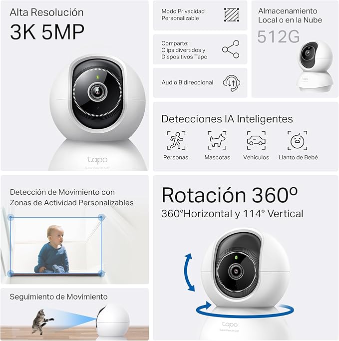 Tapo C230 Cámara WiFi Interior 360° 3K 5MP – IA (Persona/Mascota/Vehículo/Llanto), Visión Nocturna 12 m, Alarma Luz/Sonido, Audio 2 Vías, microSD 512 GB, Alexa/Google