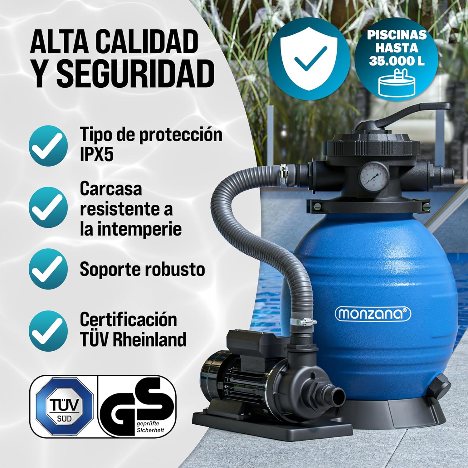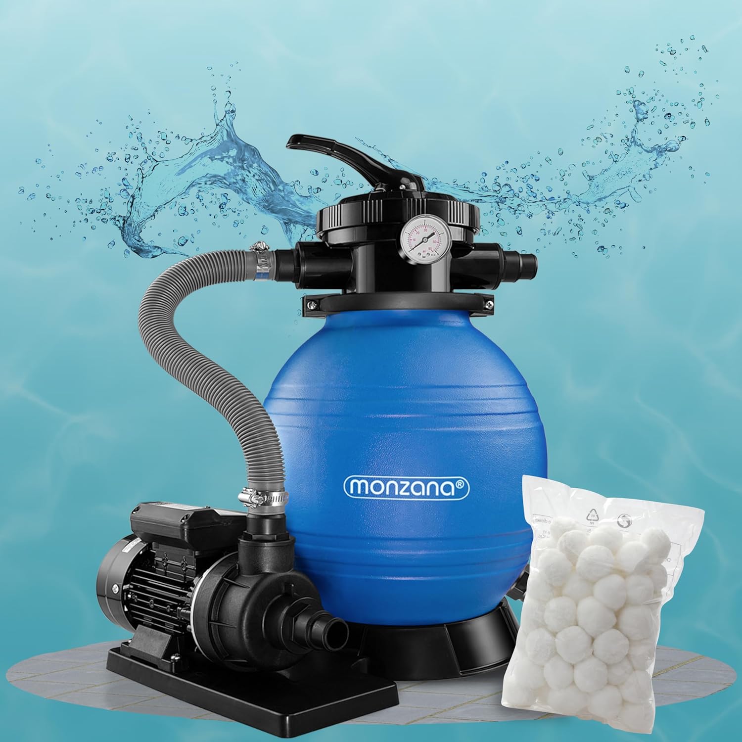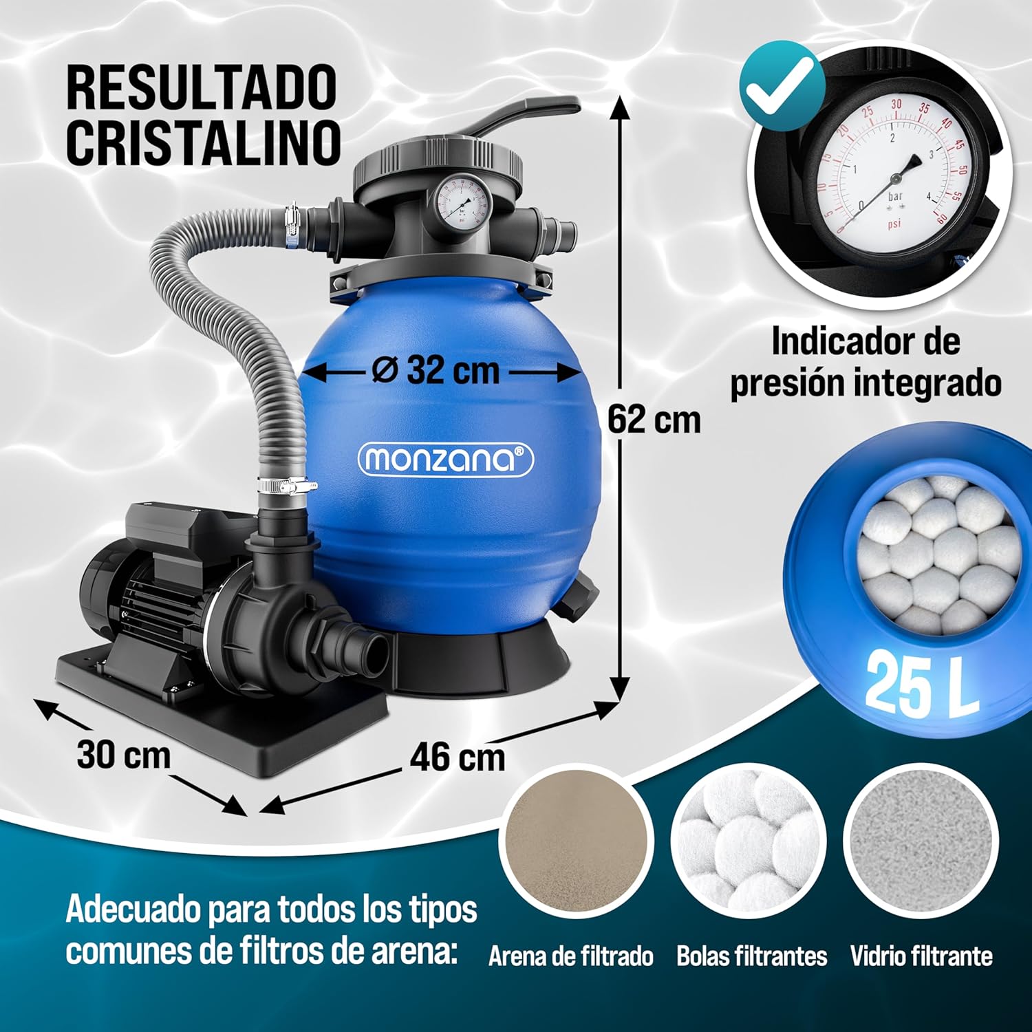 MONZANA Depuradora Filtro de Arena 10.200 L/h 400W – Válvula 7 Vías, Depósito 25 L, Adaptador Ø32/Ø38, Apta Agua Salada, Incluye Bolas Filtrantes