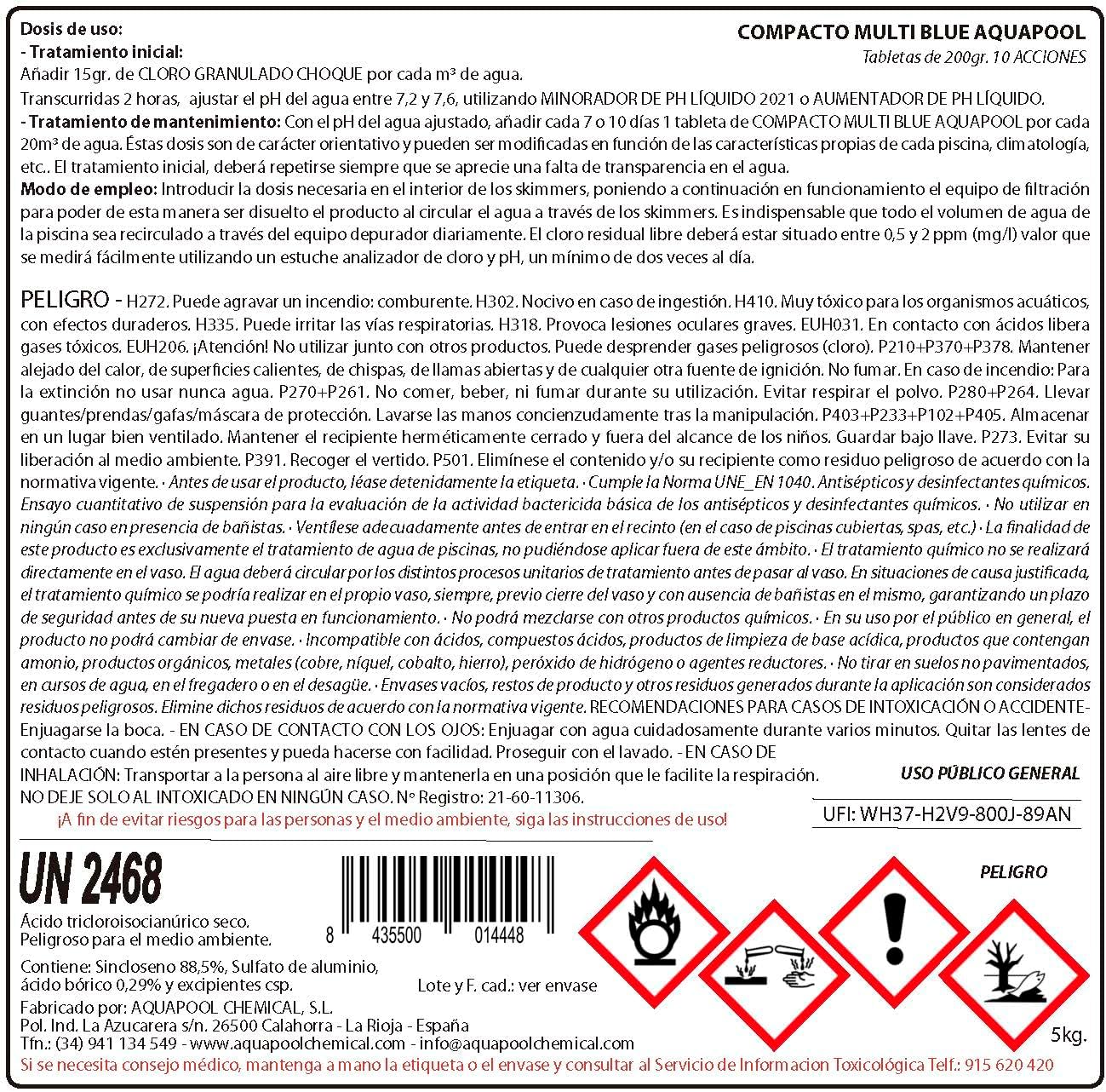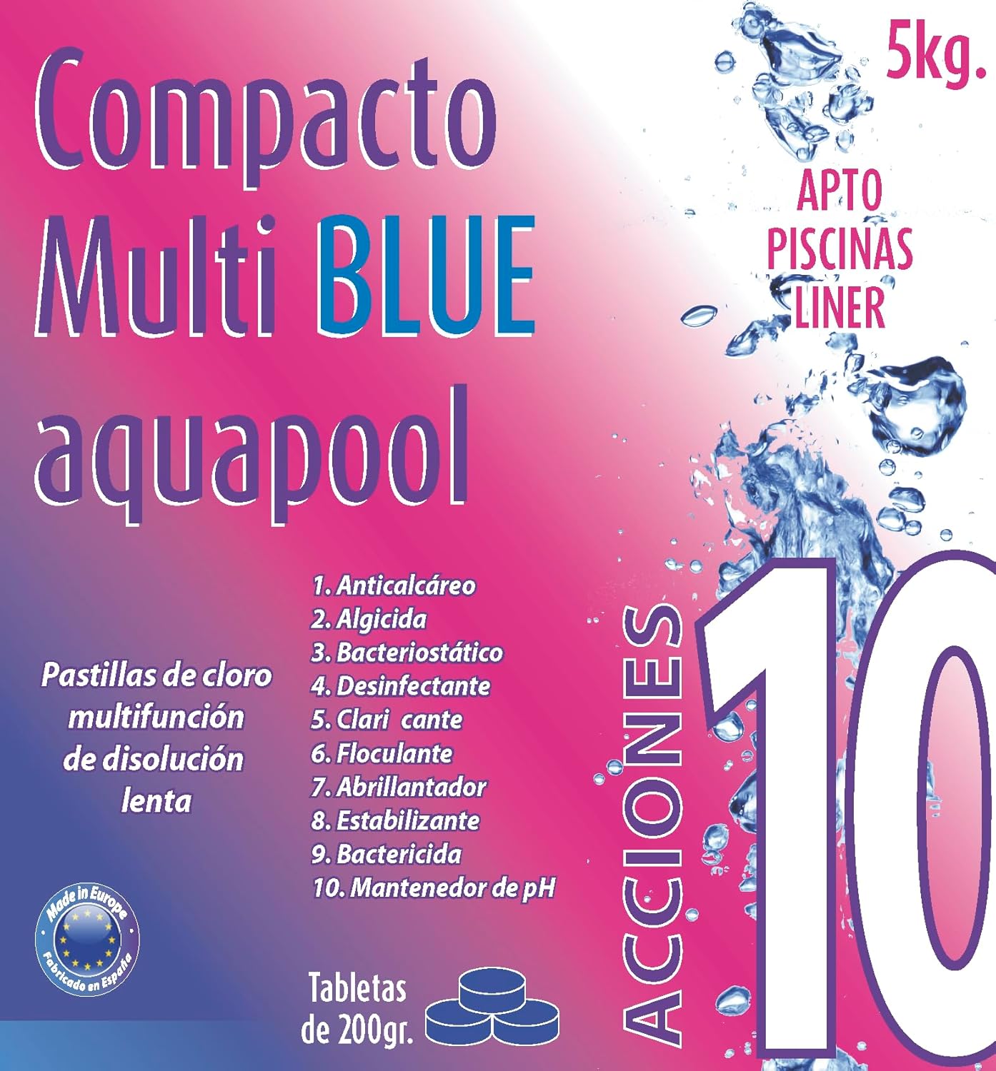 - 🧼 10 acciones: desinfectante, algicida, bacteriostático, clarificante, floculante, abrillantador, estabilizante, bactericida, antical y mantenedor de pH.