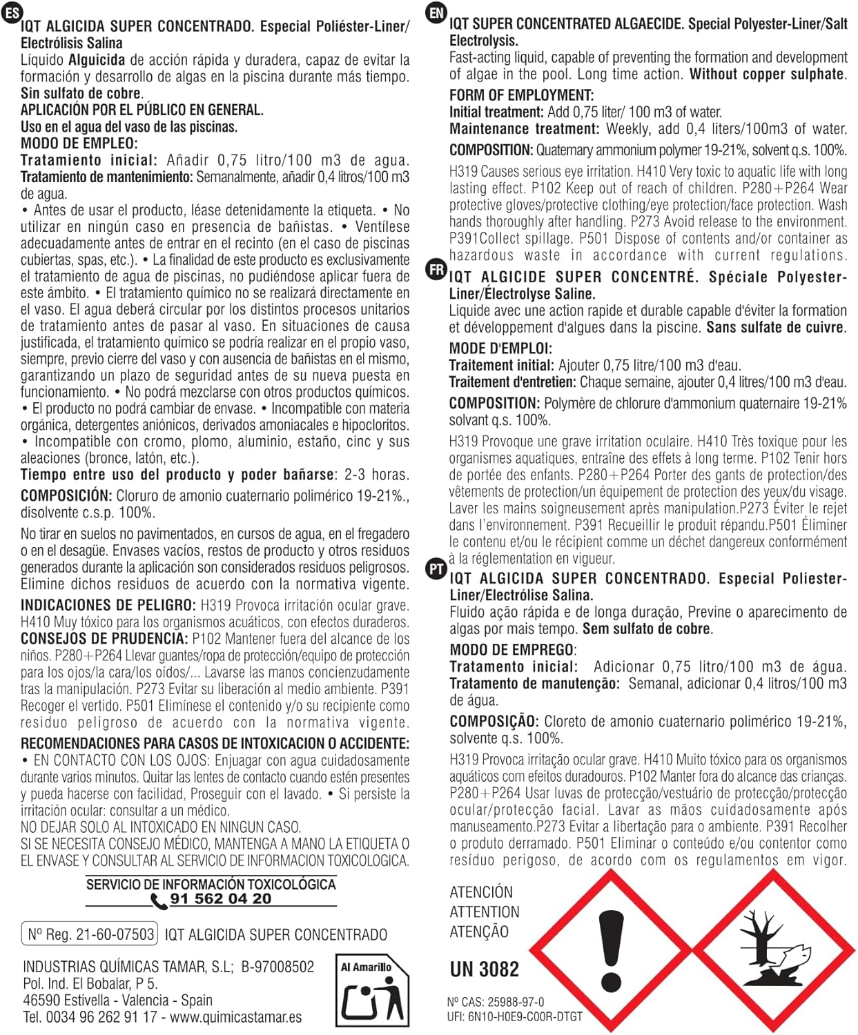 Nota: producto biocida (Registro: 21-60-07503). Utilice los biocidas de forma segura. No mezclar con otros productos y siga siempre la etiqueta/SDS.