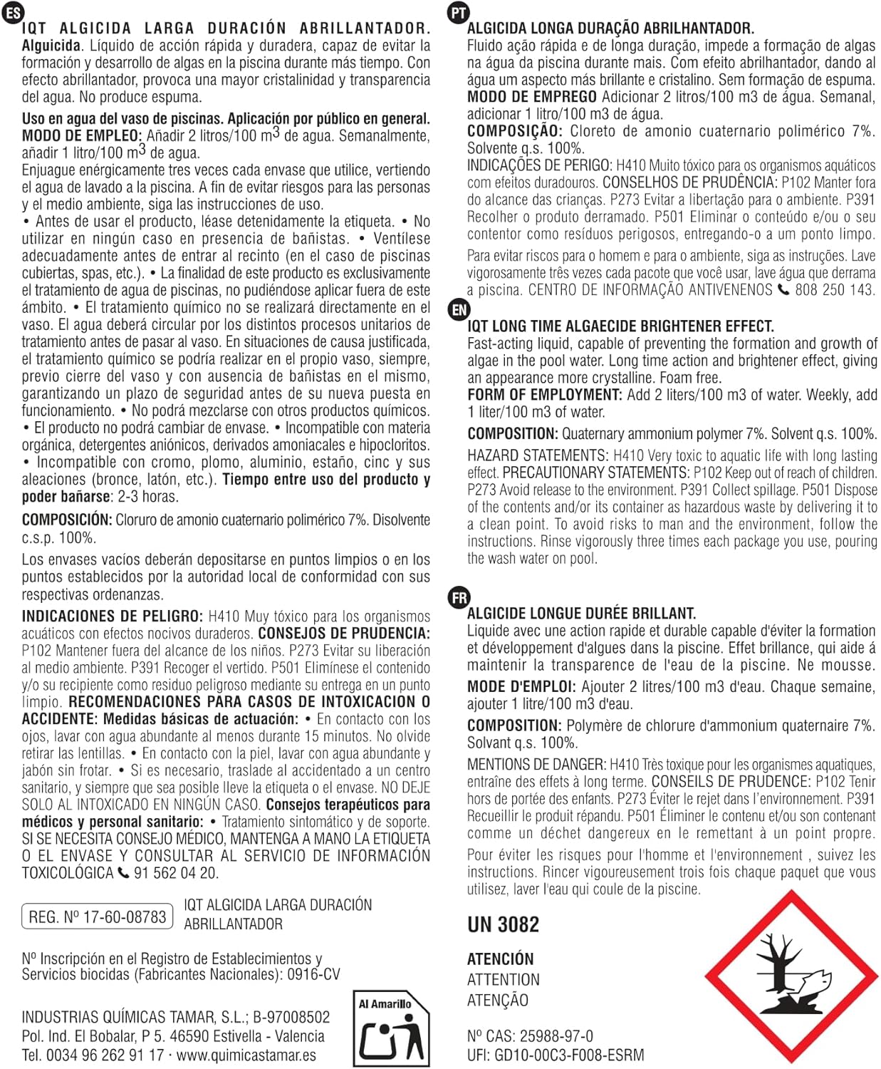 Tamar Algicida Larga Duración (5 L) – algicida preventivo para piscinas con efecto abrillantador, no espumante y sin cobre (copper-free).... Leer más...